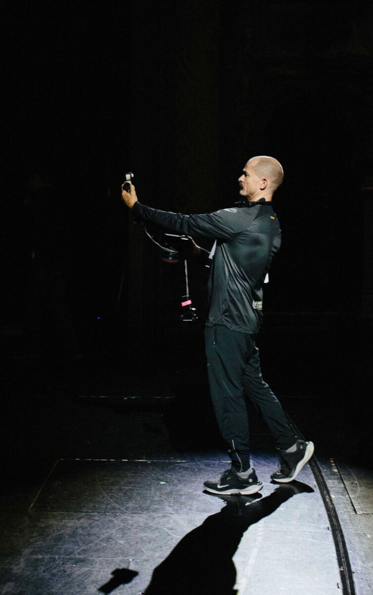 The theater scene was quite rehearsed. A little troublesome because we were invited into the national theater, where many shows were going on. It was challenging to take their design and set pieces away. We had to go in on weekends to put our sets up, plan some lighting, hang some film lights. We couldn’t just use the theatrical lighting because the blue light backstage wasn’t exposing. We also had our own show we were staging. We actually ended up adding a lot of movie lights, anyway, because the rendition of skin with theater lights isn’t as pretty as lighting for 35mm.