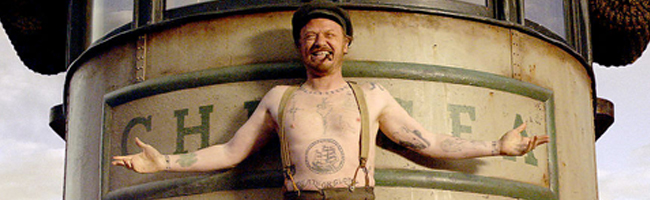 Harris has most recently been seen on Mad Men as the stern taskmaster, Lane Bryce, but the better comparison may be his role as the murderous philosophizing Traveller, Eamon Quinn on the FX series, The Riches.