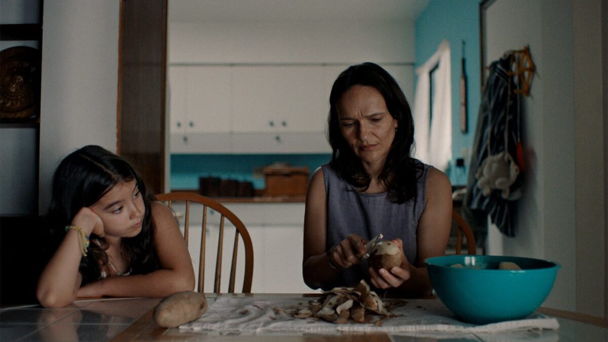 Yeah. Yes, sure. Thank you. What I like about evoking that specific image from Jeanne Dielman is: to take that very iconic image and then put a child in the shot does rupture that entire movie, because if there was a child in Jeanne Dielman [Laughs] it would be a very different film. Also, I wanted to show a mother who is… there’s a lot of ways I wanted to show the things you learn or pick up from your parents, especially between a mother and daughter—the things that you inherit, but also you pass the torch onto a child, and she’s learning to absorb her mother’s stress, also, in that moment. But I really did want to create a sense of: you start most scenes with this mundane, bored summer reality—which is true for most of our summers, I would imagine—and then by the end of it, it is in some way disrupted by Jeremy’s behavior.